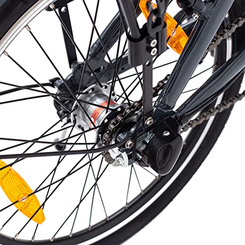 Compact opgeborgen: de vouwfiets kan met een paar eenvoudige stappen tot een vouwmaat van ca. 38 x 95 x 65 cm (b x l x h) opgevouwen en is dankzij het lichte gewicht van 25 kg goed te vervoeren en eenvoudig op te bergen, of het nu in de auto, caravan of trein is, ideaal voor kampeerders en pendelaars.